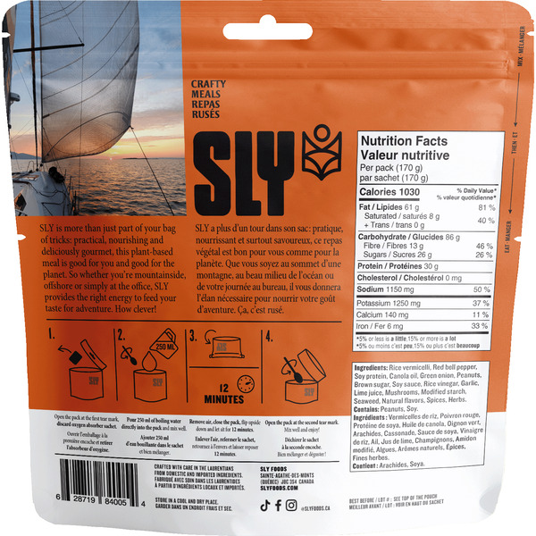 Rice vermicelli, Red bell pepper, Soy protein, Canola oil, Green onion, Peanuts, Brown sugar, Soy sauce, Rice vinegar, Garlic, Lime juice, Mushrooms, Modified starch, Seaweed, Natural flavor, Spices, Herbs.