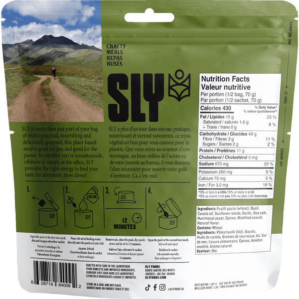 Fusilli pasta (wheat), Canola oil, Basil, Sunflower seeds, Garlic, Nutritional yeast, Sea salt, Spices, Herbs.